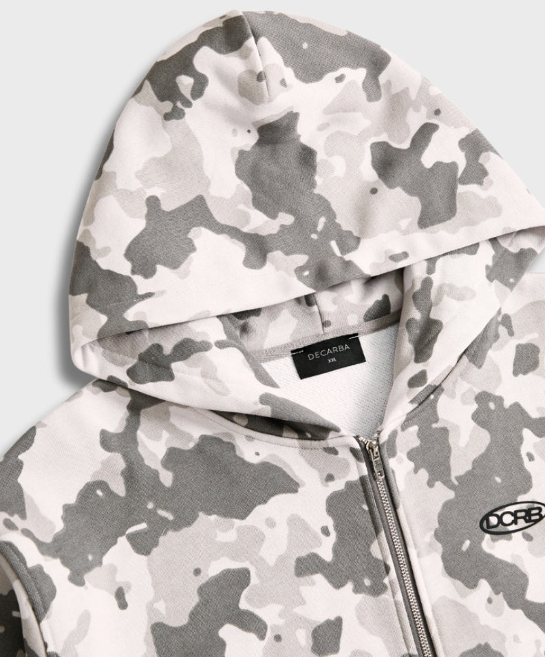 Oversized French‑terry zip‑up delivers rugged camo warmth.